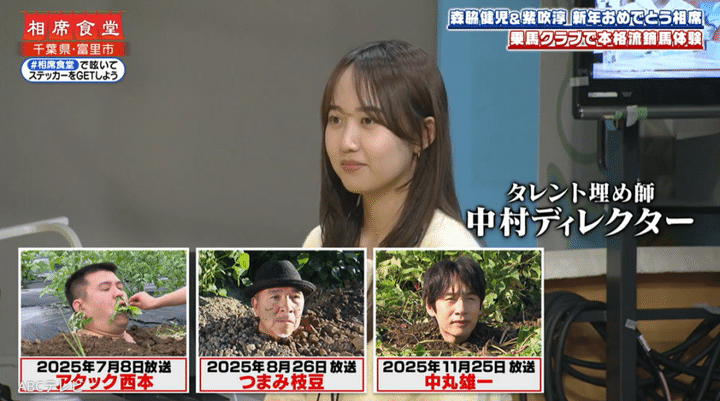 『相席食堂』の新人女性ディレクターは、MCのお笑いコンビ千鳥から「埋め師」と呼ばれている。これまで彼女は、YouTubeのコント動画が大人気なジェラードンのアタック西本、キレられてガチ揉めしたつまみ枝豆、紆余曲折経て活動を再開した中丸雄一を畑に埋めて、千鳥に衝撃を与えた。