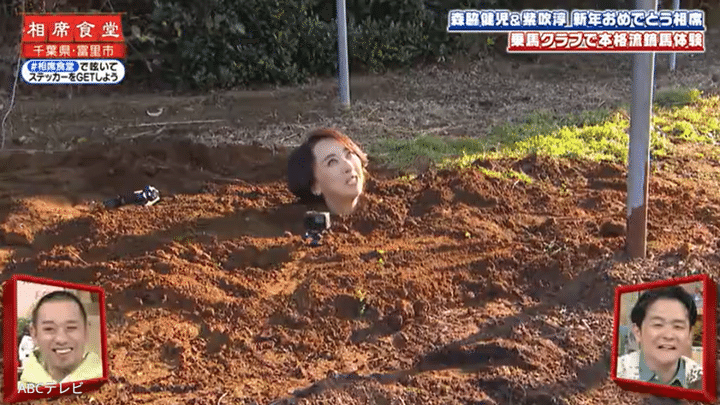 画面左下をよ~く見てみると、なんと紫吹の顔以外が馬場に埋まっていたのだ! 目の前で疾⾛する⾺に紫吹は、「わ~近くなってきた! わ、わ、わ、わ、わぁ~! すごい大迫力!」とビックリ! 彼女のとんでもない姿は、もちろん埋め師ディレクターの仕業だ。