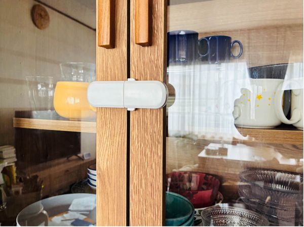 さらに食器の飛び出しを防ぐために、ガラス戸部分にはセリアのベビーグッズ「開き戸安全ロック」を取り付けます。