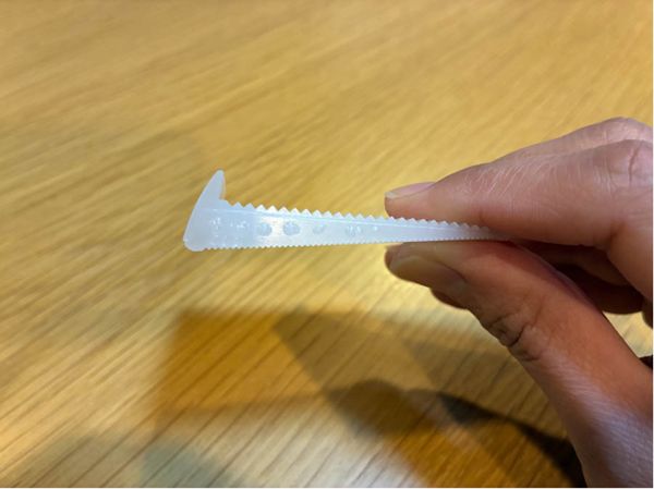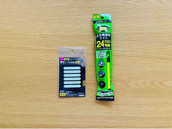 もう一つが「災害備蓄用ライト(税込み220円)」。スティックを折り曲げると24時間発光(メーカー公称値)します。吊り下げ用フックが付いているので、リビングにぶら下げておけば、いざという時にとりあえずの照明として役立ちそうですね。