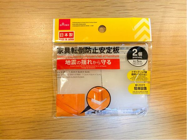 そんな記憶もあるので、よりしっかりと転倒防止策を講じたいところ。そこで、100円ショップで見つけた「家具転倒防止安定板」で、食器棚の下部分も固定することにしました。