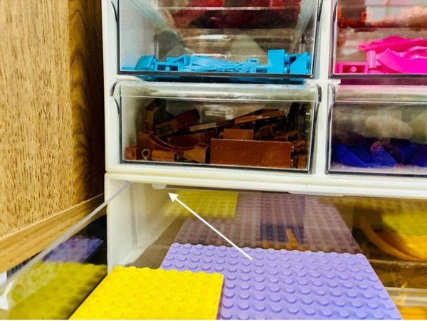 レゴに限らず、文具や生活雑貨などを収納した引き出しの中身が散乱すると、避難の邪魔になって危険です。そこで引き出しが飛び出してしまわないようにひと工夫してみました。使うのはダイソーの「クッションシール」。