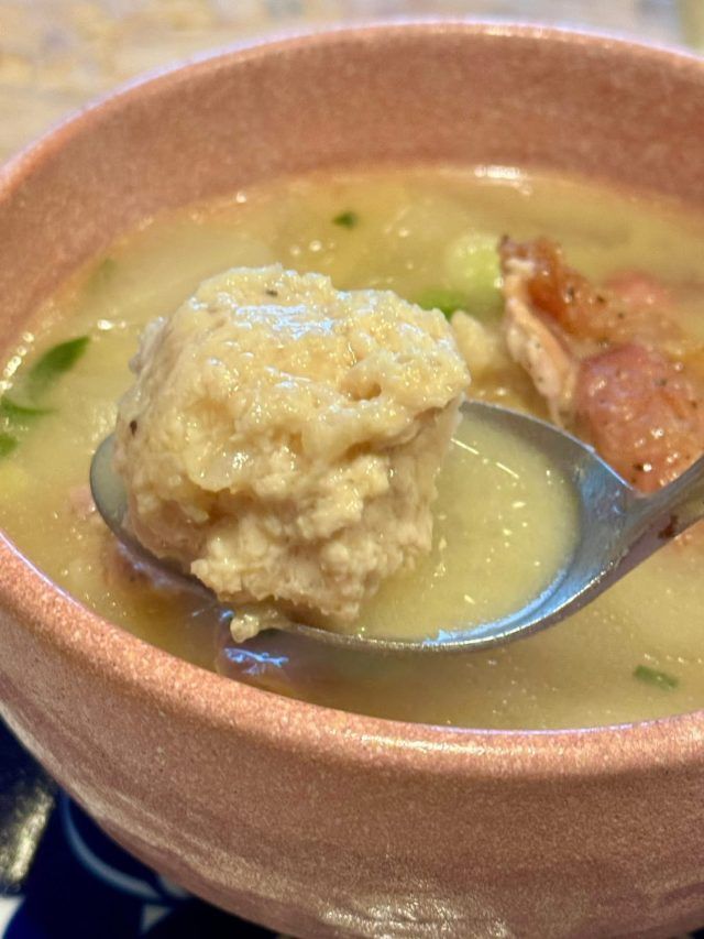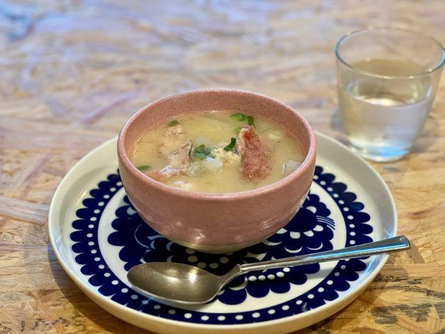 ほかほかのスープには、大根などの野菜や、肉団子、鶏肉など具材がたっぷり。 白味噌ベースでやさしい味わいです。