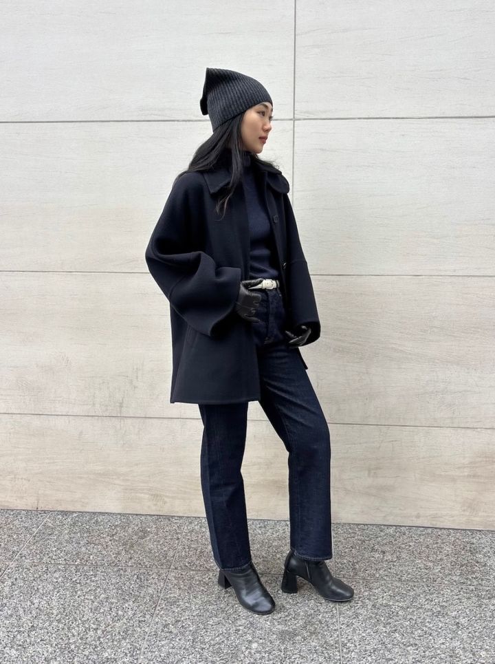 「裾に向かって広がるAラインシルエットのコートはデ・プレのもの。袖口にボリュームのあるコートとニット帽の組み合わせをストレートデニムで引き締め、全体にシャープなバランスを加えています。また最近はワントーンスタイルが好きなので、ネイビーをメインにしたコーデに、白いベルトで差し色を入れました」