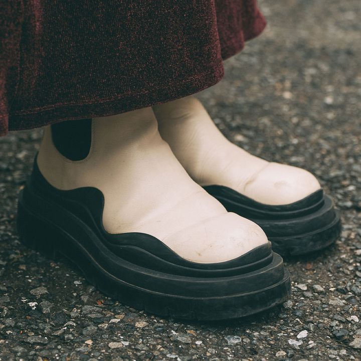 『バレンシアガ』のブーツでモードな雰囲気をトッピング。波打つラインが装いに遊び心をプラスしてくれる。