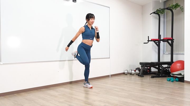 片足を後ろに蹴り上げ、かかとをお尻にタッチさせるイメージで行います。左右交互で実施してください。