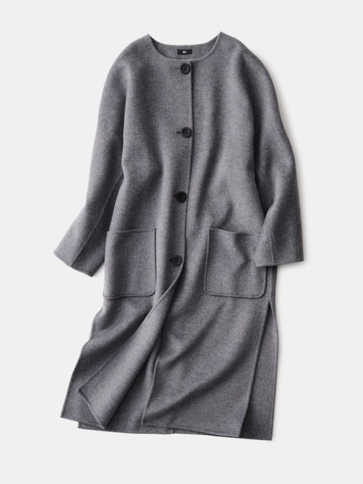ウールブレンドリバーカラーレスロングコート 〈ダークグレー〉27,000円