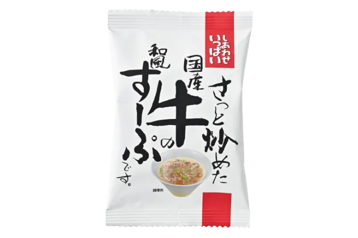 しあわせいっぱい さっと炒めた国産牛の和風すーぷ 173円/炒めた牛肉と白ネギの風味が香ばしい。カツオと昆布の出汁も際立っています。