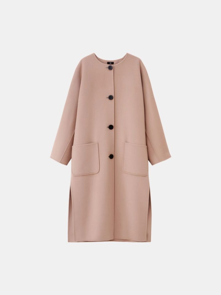 ウールブレンドリバーカラーレスロングコート 〈ベージュ〉27,000円