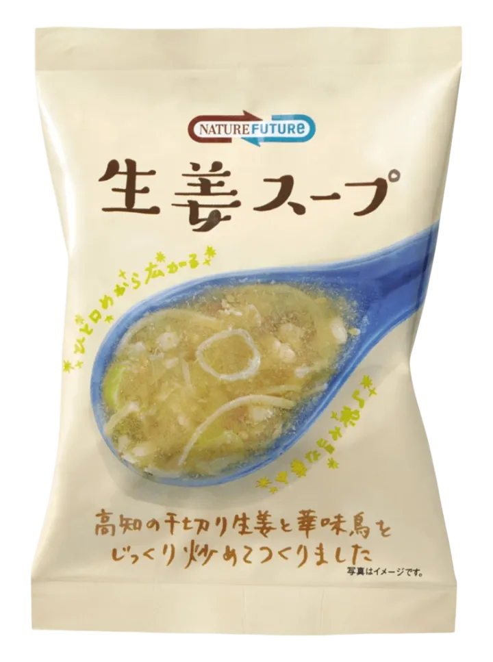 NATUREFUTURe 生姜スープ 151円/高知県産の千切りとペーストの2種類の生姜、国産白ネギ、九州産銘柄鶏を使ったとろみのあるスープ。