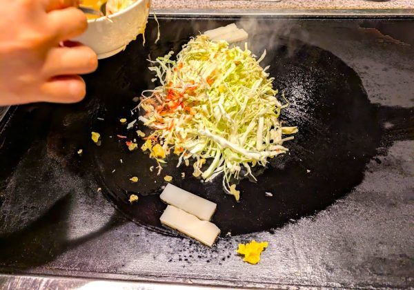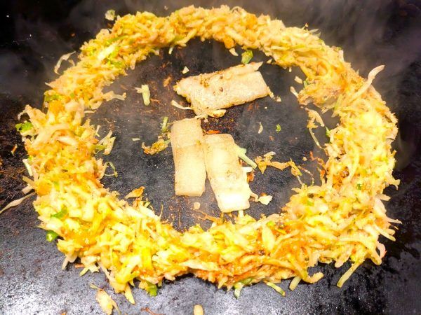 もんじゃの出汁とチーズを残して鉄板で焼きます。キャベツ等の具材は、スタッフさんによるシャキシャキシャキーンと華麗なる技術で焼き、