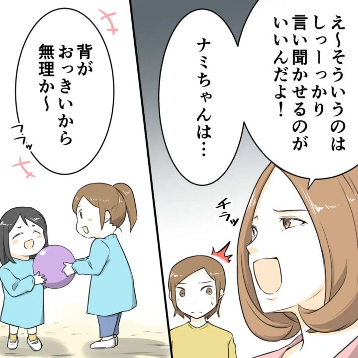 しかし、ハルちゃんママは「え~。そういうのはしーっかり言い聞かせるのがいいんだよ!」とユウちゃんママに得意げにアドバイス。そしてチラッと私の方を見ると、ナミを見て「ナミちゃんは・・背がおっきいから無理か~」と同情するように言ったのです。