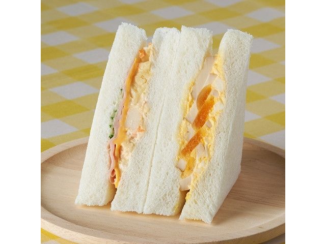 3枚の食パンにハム・チーズ・たまごサラダをサンドし、ハーフカットして焼き上げた、ボリュームのある惣菜パンです。