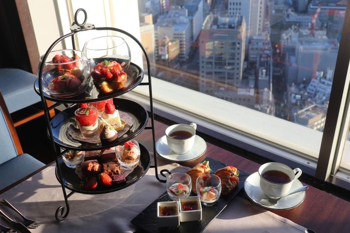 アフタヌーンティーは、スイーツとセイボリーにいちごがふんだんに使用されたかわいらしくも上品なビジュアルです。窓から一望できる都心の風景も特別感があり、テンションが上がります!