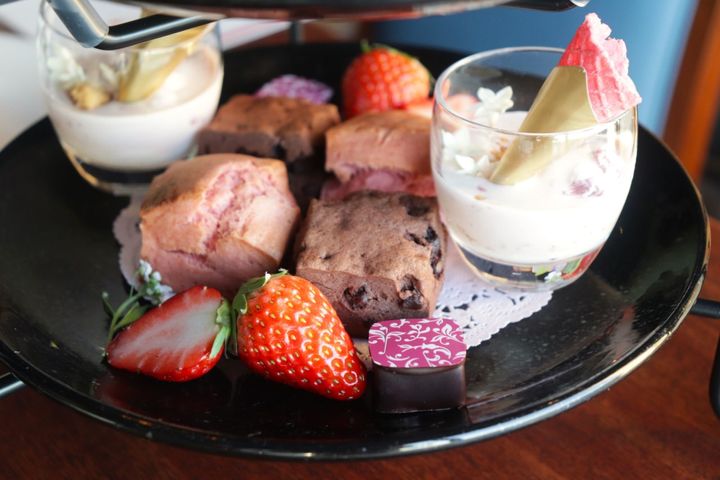 また、下段にはショコラオレンジ・いちごの2種のスコーンと「苺とチーズムースのパフェ」が並んでいます。