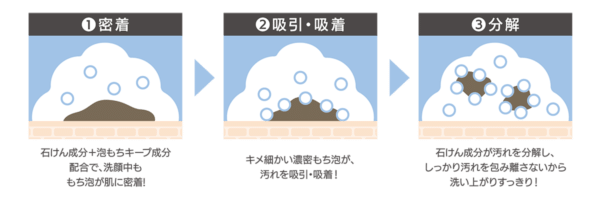 弾力のあるキメ細かい濃密もち泡が肌に密着、汚れを吸引・吸着して、肌悩みの原因となる皮脂や古い角質をしっかりオフ。うるおうのにすっきりとした洗い上がりです。