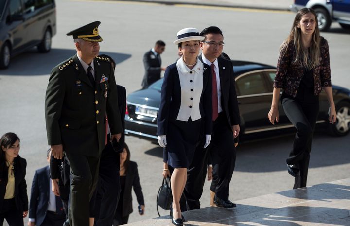 2014年、トルコ・イスタンブールで開かれた会議に出席した際には、ブラックのピンストライプ柄ジャケット&パンツのセットアップスタイルで、クール&エレガントに。トルコブルーのネックレスがアクセントとなり素敵です。