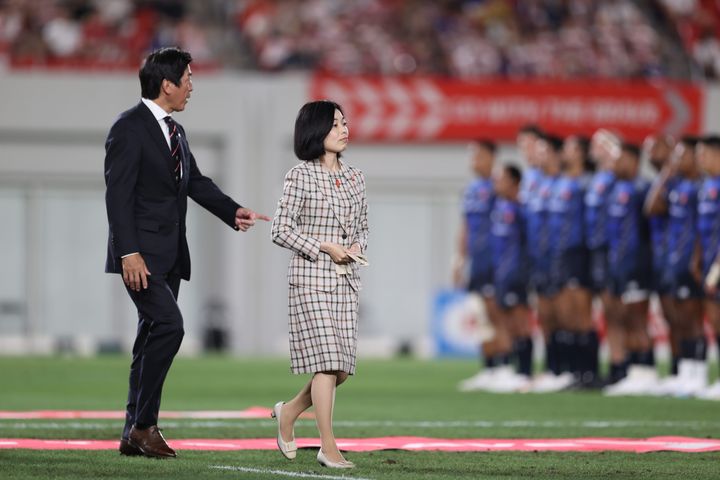 日本ラグビーフットボール協会の名誉総裁を務める彬子さま。“リポビタンDチャレンジカップ2019”の日本代表戦を観戦したこの日は、シックなチェック柄のセットアップに、エクリュカラーの手袋やリボンパンプスをコーディネート。魚の形をしたネックレスがチャーミングなアクセントに。