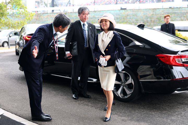 三重県、鈴鹿サーキットで開催されたF1日本グランプリを観戦。大会最高名誉総裁として表彰台でお言葉を述べられたこの日は、ピークド・ラペルのバイカラージャケットを凛と着こなして。金ボタン、紺×白配色のマリンムードなコーディネートが爽やかでした。