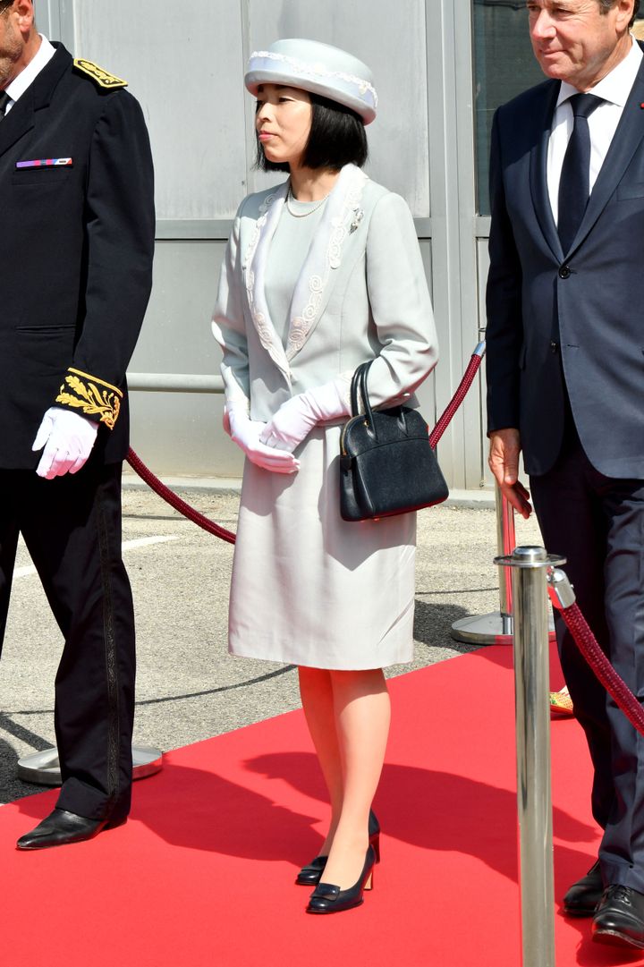 訪問先のフランス、ニース・コートダジュール空港にて。ニースの空や海を思わせる、淡いブルーの装いで到着されました。ショールカラーのジャケットや帽子には優美なレースがあしらわれ、さらにパールのネックレスやブローチで華やかに。