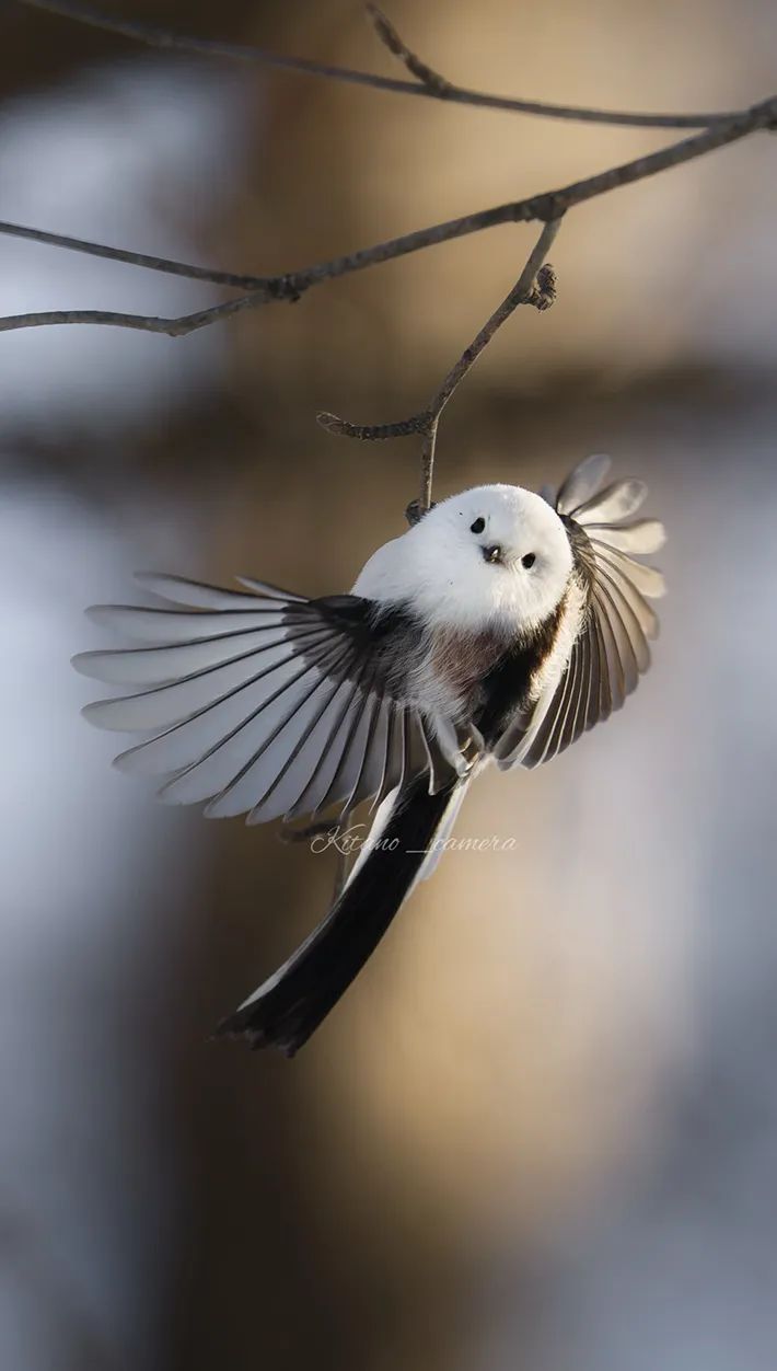 美しい羽根を広げたシマエナガは、偶然かもしれませんが目線をカメラに向けています。
