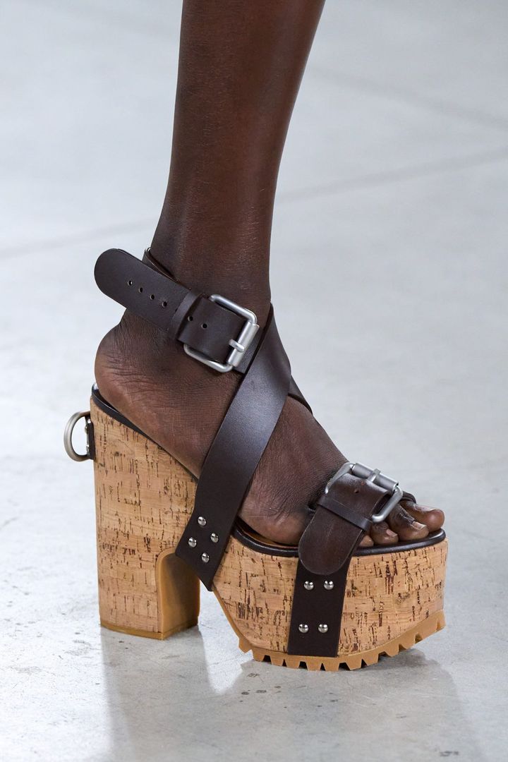 「モスキーノ」ではチャンキーなコルクウェッジサンダルが、「ボッテガ・ヴェネタ」では足の甲を覆うタイプのクロッグ(サボ)サンダルが登場し、ボリューミーで個性的な足元を演出していた。