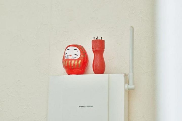 仕事場でもある、広いLDKの壁面にとりつけられているインターホン。その上に置かれている赤いリリアンは、お母さまが亡くなったあと、親族で荷物の整理をしているときに出てきたもの。
