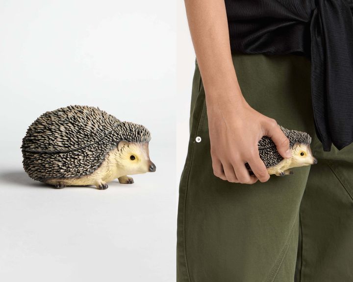 まず1つ目は、ハリネズミをそっくりそのままかたどった、アイキャッチーなクラッチバッグ。2024年秋冬ウィメンズカプセルコレクションで登場してからずっと気になっており、ついに購入してしまいました。繊細に表現された毛並みや、思わず目が合ってしまう愛らしい表情、丸みのあるフォルムまで驚くほどリアルで、バッグというよりも小さなアートピースのよう。背中部分がパカッと開くユニークな構造も遊び心たっぷりで、スタイリングの主役になるのはもちろん、部屋に置いて眺めているだけでも気分が上がる存在です。