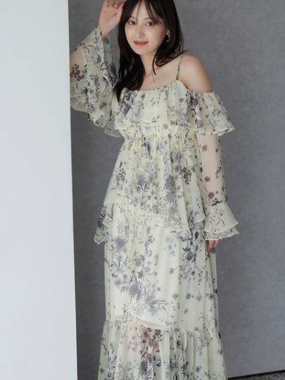 たっぷりフリルが軽やかに揺れるドラマティックなオフショルワンピース。柔らかなシフォン生地に柔らかなタッチの花柄が春のムードを演出。胸元やウエストまわり、袖口に波打つように仕立てた立体感のあるフリルデザインが動くとふわふわと揺れて、着こなしを印象的に魅せてくれます。