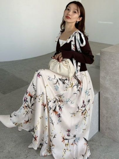 繊細なタッチで描いたオリジナルのフローラルプリントに、取り外し可能なビッグリボンをトッピングしたワンピース。リボンは肩の上で結んだり、肩ひものつけねや後ろで結びつけてもOK。サテンのような光沢感のある風合いが洗練されたムードを添えます。まだ肌寒い時期は、カーデを羽織って肩からリボンをのぞかせるスタイリングが可愛い。