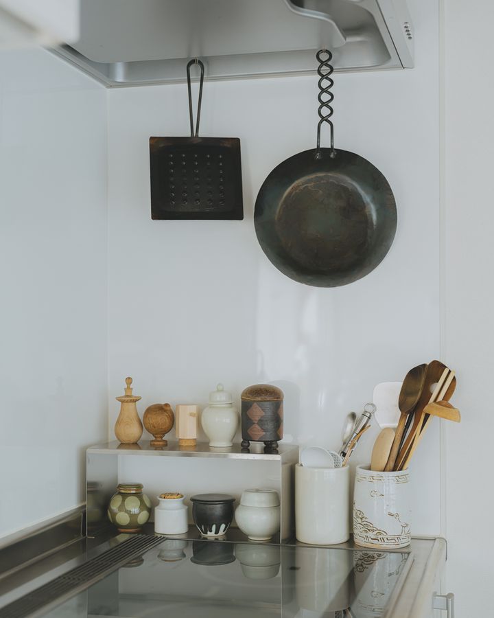 色や質感がバラバラのようでいて、どれもゆうきさんの感性で統一されています。「毎日ここを眺めながら料理をする時間が幸せです」と笑顔で語ってくれました。