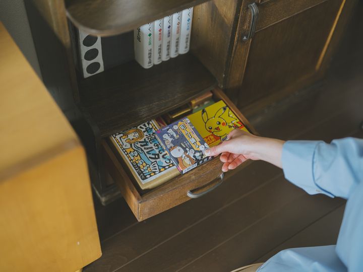 また、使う頻度の高いおもちゃ類は、本棚も兼ねた棚の引き出しに入れておくことで、リビング、ダイニングで遊んでもすぐに片づけられるようになっています。