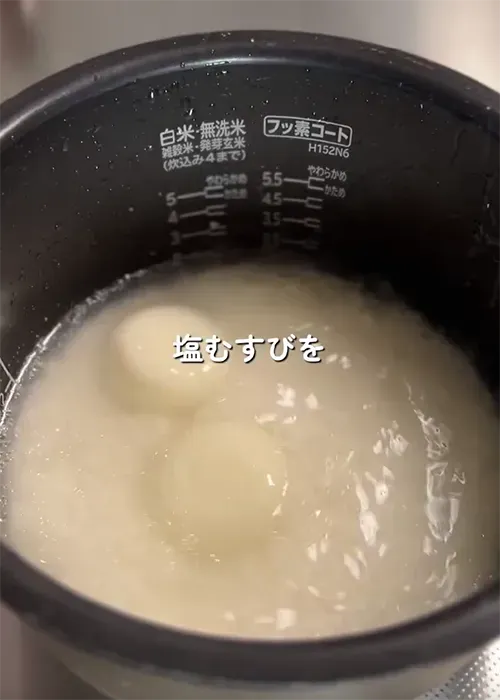 『もち塩むすび』は炊飯前に切り餅を入れるだけの、失敗知らずのレシピのようですね。