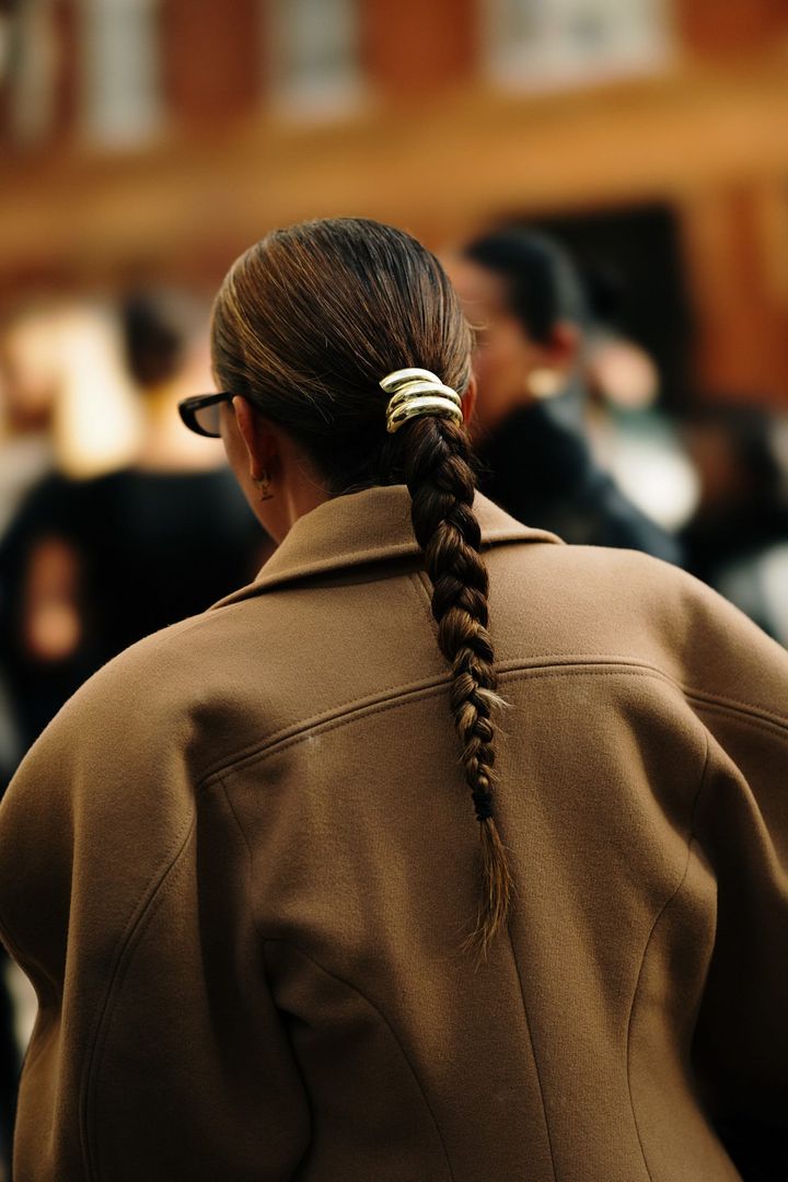今シーズンのストリートで多く見かけた三つ編みポニー。タイト&ウェットな質感で三つ編みの甘さを抑え、知的なモードさを引き出すのがファッショニスタ流。