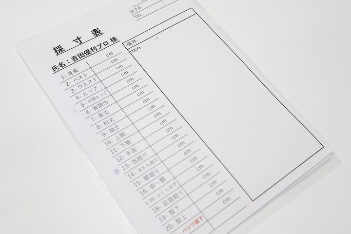 スタジオの一角で始まった採寸は、決められた項目に沿って手早く進んでいきます。肩幅、バスト、ウエスト、ヒップに加え、腕まわりや太もも、ふくらはぎ、股下まで。採寸表には20項目以上が並び、毎年この工程が欠かさず行われていることが分かります。