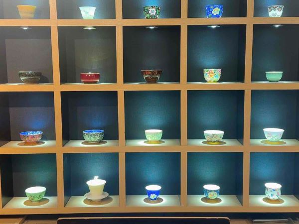 壁一面の棚にずらりと並ぶ、色とりどりの茶杯。 産地や作られた時代、描かれた絵柄もひとつずつ異なる茶杯たちが、スポットライトを浴びてキラキラと輝いています。
