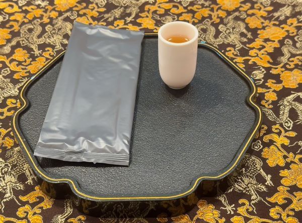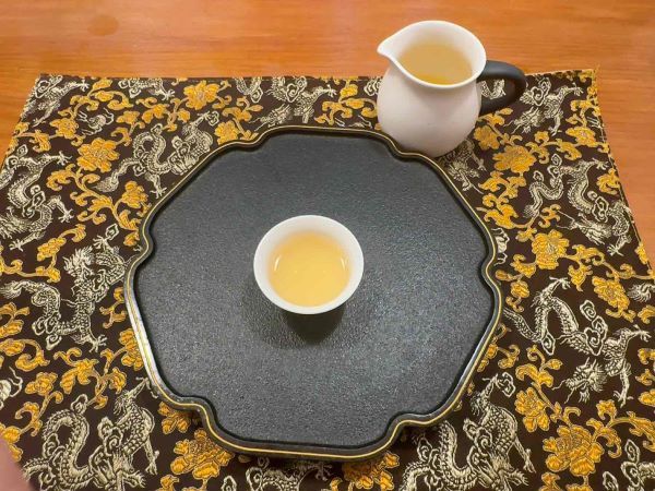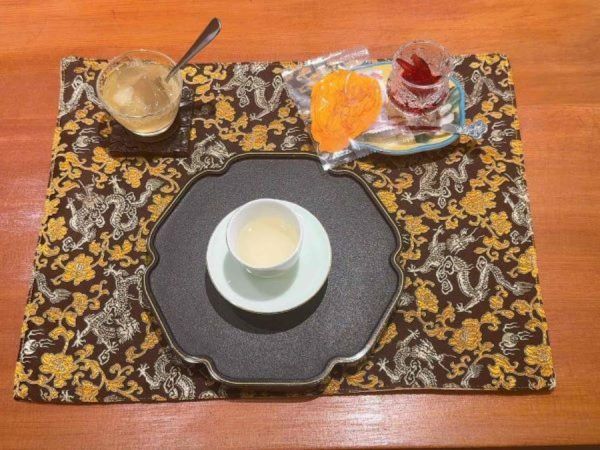 メニューから好みのお茶を選ぶと、はじめに冷たい水出し烏龍茶が提供され、奥深いコクと、喉を通った後に広がる爽やかな余韻を楽しめます。龍の刺繍が施されたマットや、壁一面に並ぶ美しい茶器の棚が、本格的な雰囲気を引き立てます。