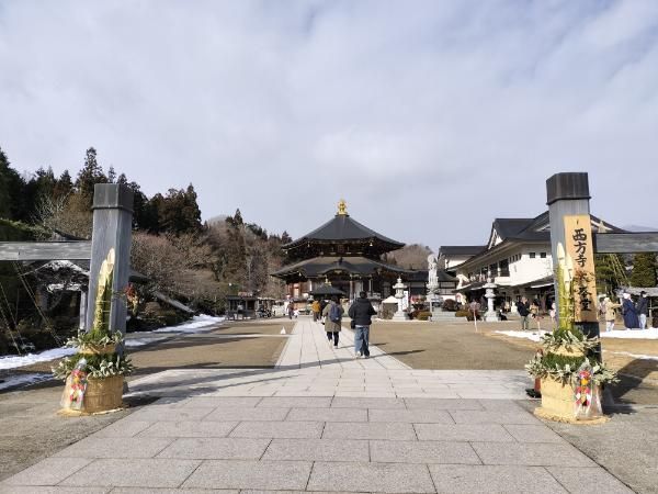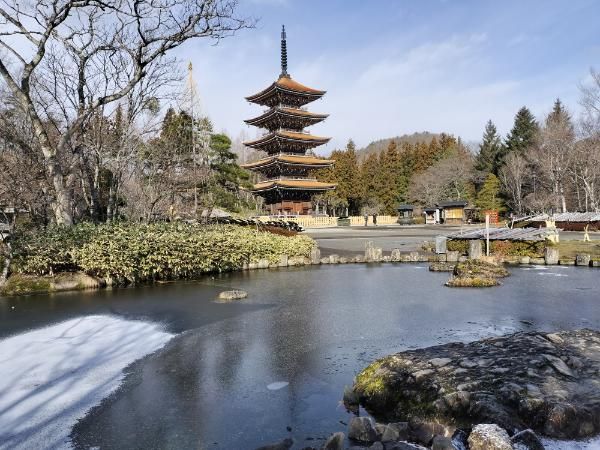 奥に見えるのは、堂々と佇む定義如来五重塔。 静かな冬の空気の中、その姿がより凛として見えます。