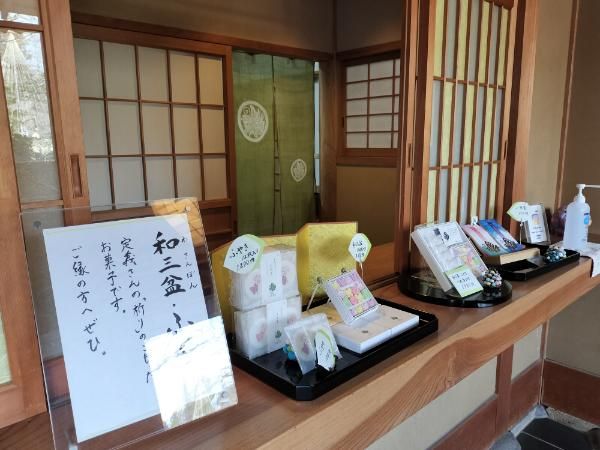 定義さんの参拝の記念に、おみやげの用意もあるんです。 和盆栽やふやき、詰め合わせや一筆箋が並んでいるので、祈りのこもった特別なお菓子をお土産にしてはいかがでしょうか。