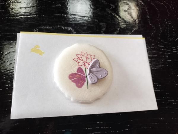 さてさて、まず運ばれてきたのは、温抹茶についてくる干菓子です。 定義さんの寺紋のあげは蝶や蓮の花をあしらったものだそうで、とても可愛らしい。