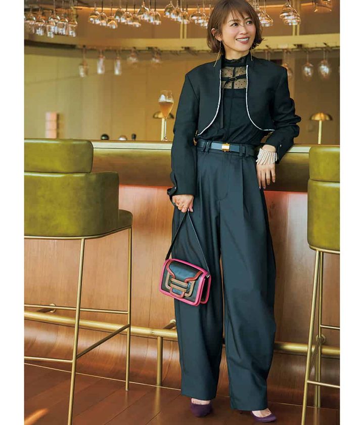 ジャケット¥26,400(メゾンスペシャル/メゾンスペシャル 青山店)プルオーバー¥24,200(ルームエイト ブラック/オットデザイン)パンツ¥19,800(メゾンスペシャル/メゾンスペシャル 青山店)バッグ¥157,300(ピエール アルディ/ピエール アルディ 東京)パンプス¥148,500(クリスチャン ルブタン/クリスチャン ルブタン ジャパン)ベルト¥75,900(エストネーション/エストネーション)ピアス¥31,900(リューク)ブレスレット¥22,000(アルアバイル)リング¥44,000(カラットアー/イセタンサローネ 東京)