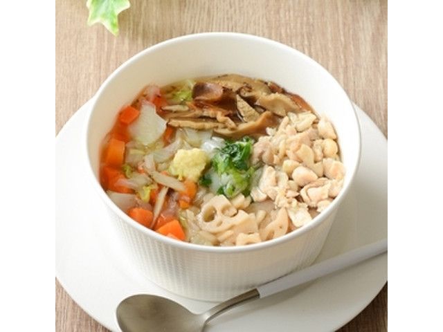 人参・牛蒡・蓮根・ダイスカットした鶏もも・白菜・玉ねぎ・ねぎ・椎茸等が入った、生姜とだしを効かせたスープご飯です。