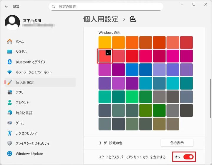 さらに、「個人用設定」からアクセントカラーを適用すれば、タスクバーの色を自由に変更して気分転換を図ることもできます。