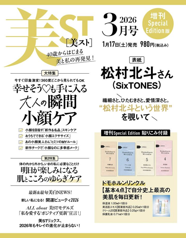 1月17日(土)発売・美ST2026年3月号のネット書店予約がスタートしました!松下奈緒さん&松村北斗さん(SixTONES)が表紙を飾ります。付録は、ドモホルンリンクルの基本4点が3誌共通の貼りこみ付録に。本誌にはestの角栓崩壊ジェル洗顔とmegood beautyの韓国陶器肌シートマスク。さらに、特別版にはp/dのご褒美スクラブ&導入美容液セットとシーボンの肌磨き豪華6点セットが付録につきます!完売必至につき、お早めにご予約ください!