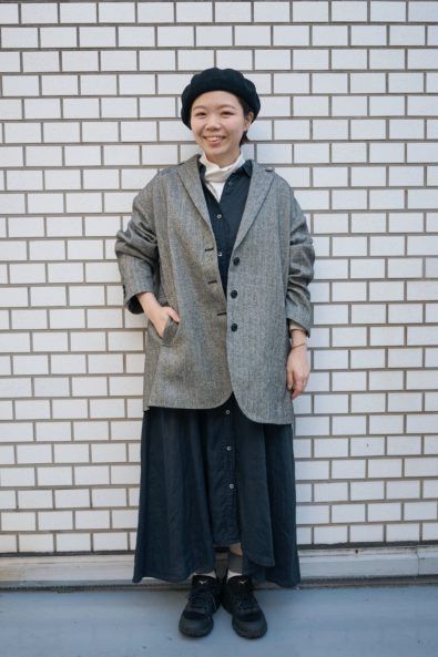 すっきりシンプルなリネンワンピースに、ハンサムなシルエットのヘリンボーンジャケットを重ねた冬の装い。