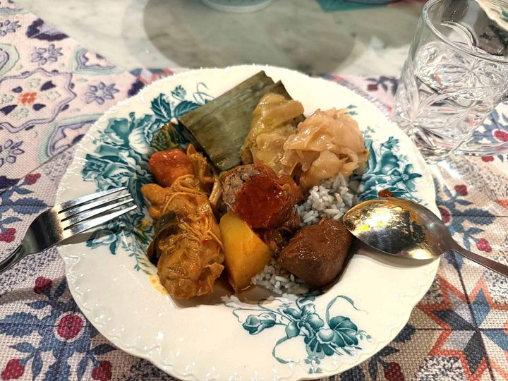 また、今回は「料理付きプラン」でオーナーのアルビンさんのお父さんが腕を振るってくれたプラナカン料理もいただきました。お肉や野菜の煮込み料理に加えて、白身魚のすり身に、ココナッツミルクやスパイスを混ぜ、バナナの葉で包んで蒸した伝統料理が並びます。それらをバタフライーピーで淡い色に染められたごはんに少しずつ盛って、混ぜながら食べるのがプラナカン風。風味がミックスされて奥行きを感じられる味わいに。