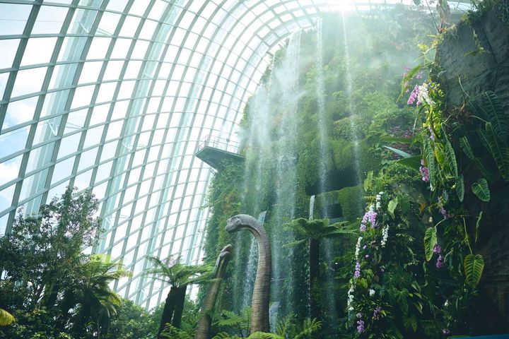 また、世界最大のガラス温室フラワー・ドームでは、熱帯から温帯まで、多様な植物を見ることができました。温室内は空調がしっかり効いていて、シンガポールの暑さを忘れるほど心地よい空間です。滝が流れ落ち、山のような植生が広がるクラウド フォレストでは、映画『ジュラシック・ワールド』とのコラボレーションが行われており、館内のあちこちに恐竜たちの姿が。迫力があり、大人はもちろん、お子さんと一緒に訪れても楽しめるスポットでした。