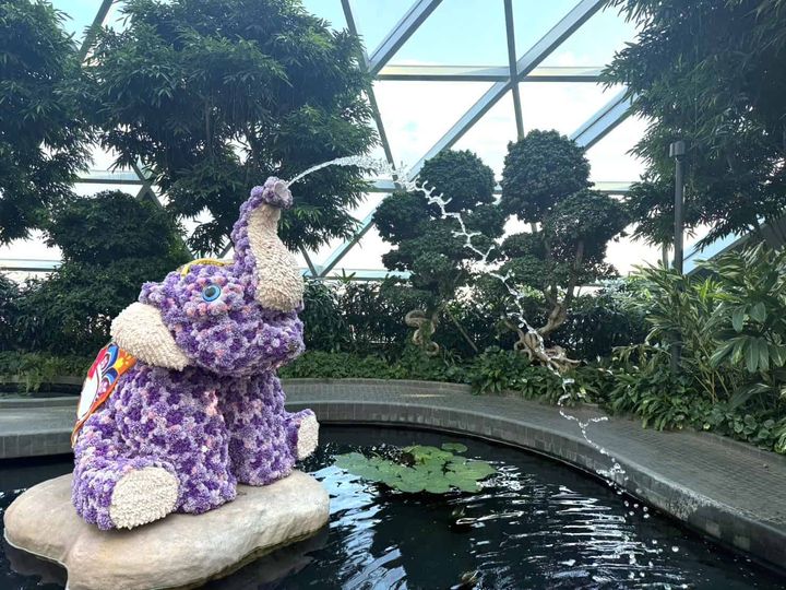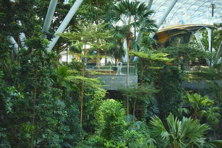 最後に訪れたのが、ジュエル・チャンギ・エアポート。SNSでよく目にしていて、一目見たいと思っていたのが、レイン・ボルテックス。高さ40メートルで「世界最大級の室内滝」と言われているだけあって、迫力は圧巻でした。その滝を囲むように広がるフォレストバレーは本物の木や植物に包まれ、空港にいることを忘れるような空間。施設の最上階にはキャノピーパークがあり、公園のような遊び場や庭園、アトラクションが揃っていました。子どもが遊ぶ場所としても、また旅の間のリフレッシュスポットとしても最適です。