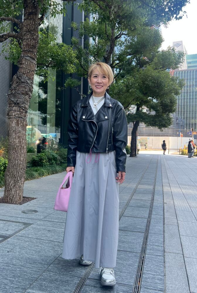 フレアスカートやピンクのバッグの甘さを、ハードなテイストのライダースジャケットで印象を引き締めて大人っぽさを加味されていますね!