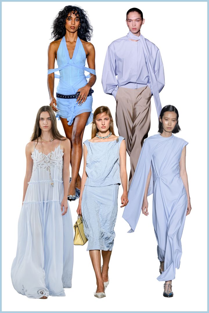 ソフトなパステルカラーの潮流の中で、今季は清潔感と知性を感じさせるアイスブルーが台頭。淡くクリーンな色調ながら、冷たさよりも透明感と軽やかさが際立ち、フェミニンにもジェンダーレスにも取り入れやすい点が支持を集めているよう。「ケイト バートン」では構築的なドレスに取り入れ、端正なシルエットに爽やかさを添え、「キム シュイ」ではボディコンシャスなミニドレスを涼やかに見せるなど、シルエットの異なるスタイルにも自然になじむ万能さが際立った。